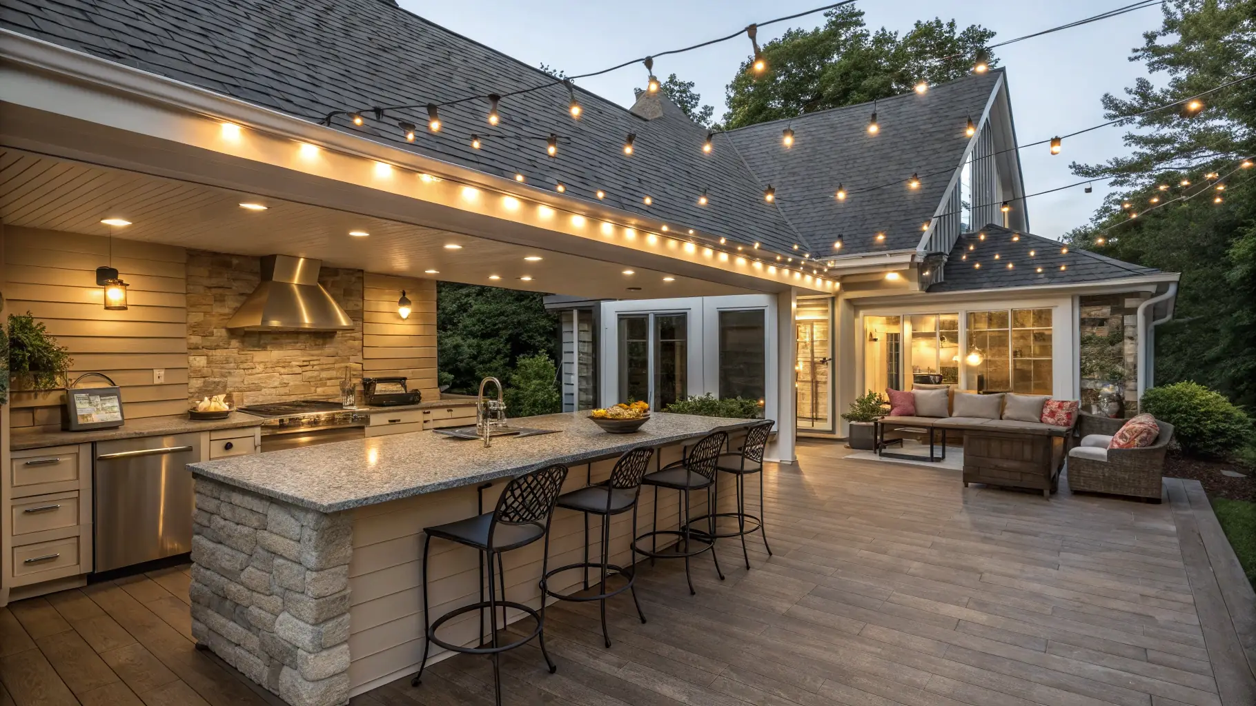 A spacious wooden deck with built-in seating and lighting, perfect for outdoor entertaining.